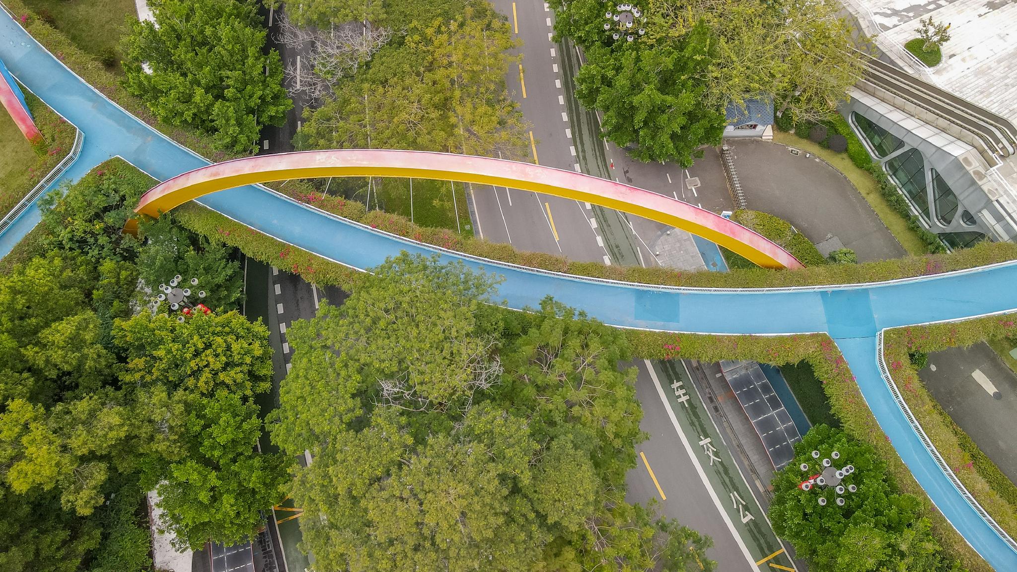 还有彩虹桥,桥面设计成五颜六色,航拍下,就像横跨在卫星城中的一道彩虹,十分的好看。