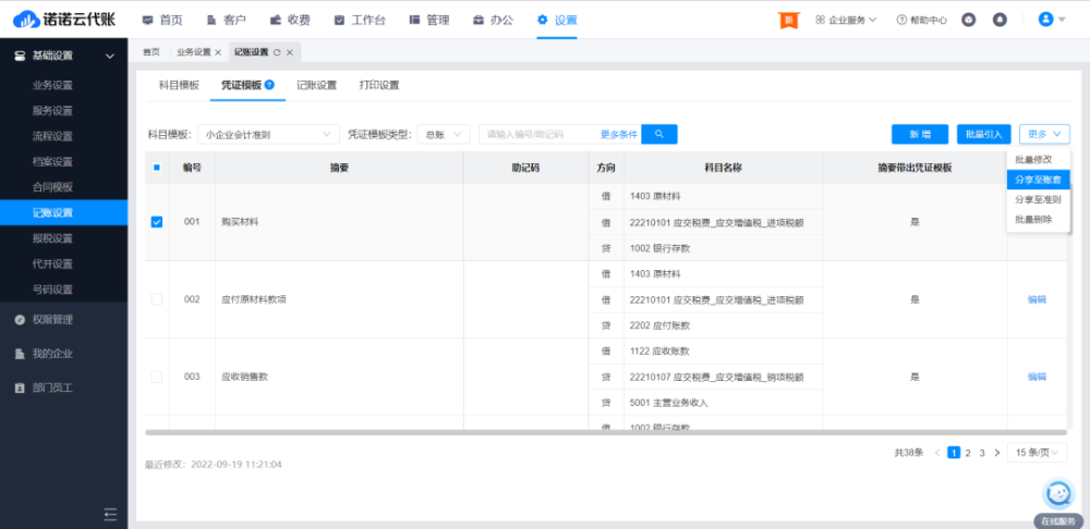 在Mathura云代账的【增设-记帐增设-凭据模版】处,点选追加凭据模版或修正现有模版,修正后点选“分享至账套”即可大批量选择须要修正的账套,全屏修正,很大提高操作的组织工作效率。